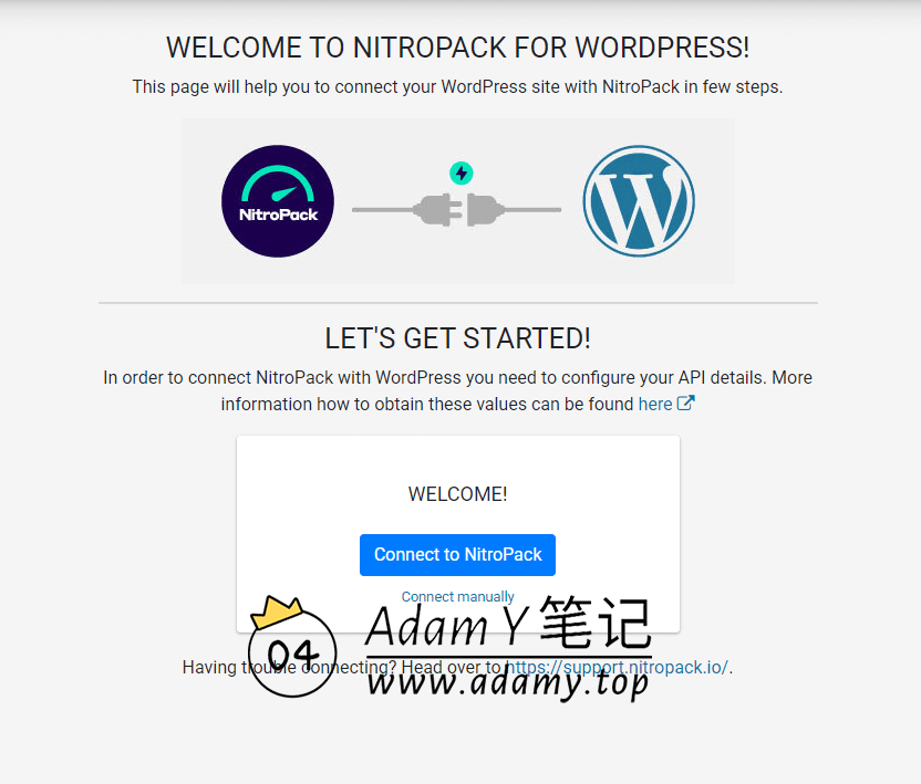 然后从WordPress后台 左侧状态栏 Settings(设置) > NitroPack 进入NitroPack的设置, 在这个界面, 点击 Connect to NitroPack, 在弹出窗口中登录NitroPack账号, 域名会自动绑定成功.